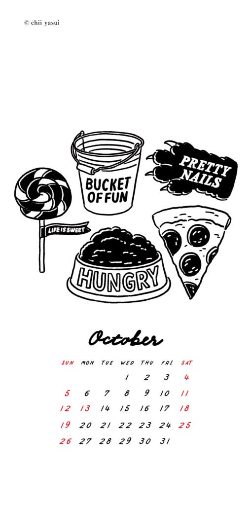 chii yasui イラストレーター グラフィックデザイナー CONTACT : chii.konishi@swgarden.jpお仕事のご相談はメールアドレスまでご連絡ください Calendar FREE download !!! 毎月末に更新 ※注意※ スマホの壁紙のみ使用可 202510Download